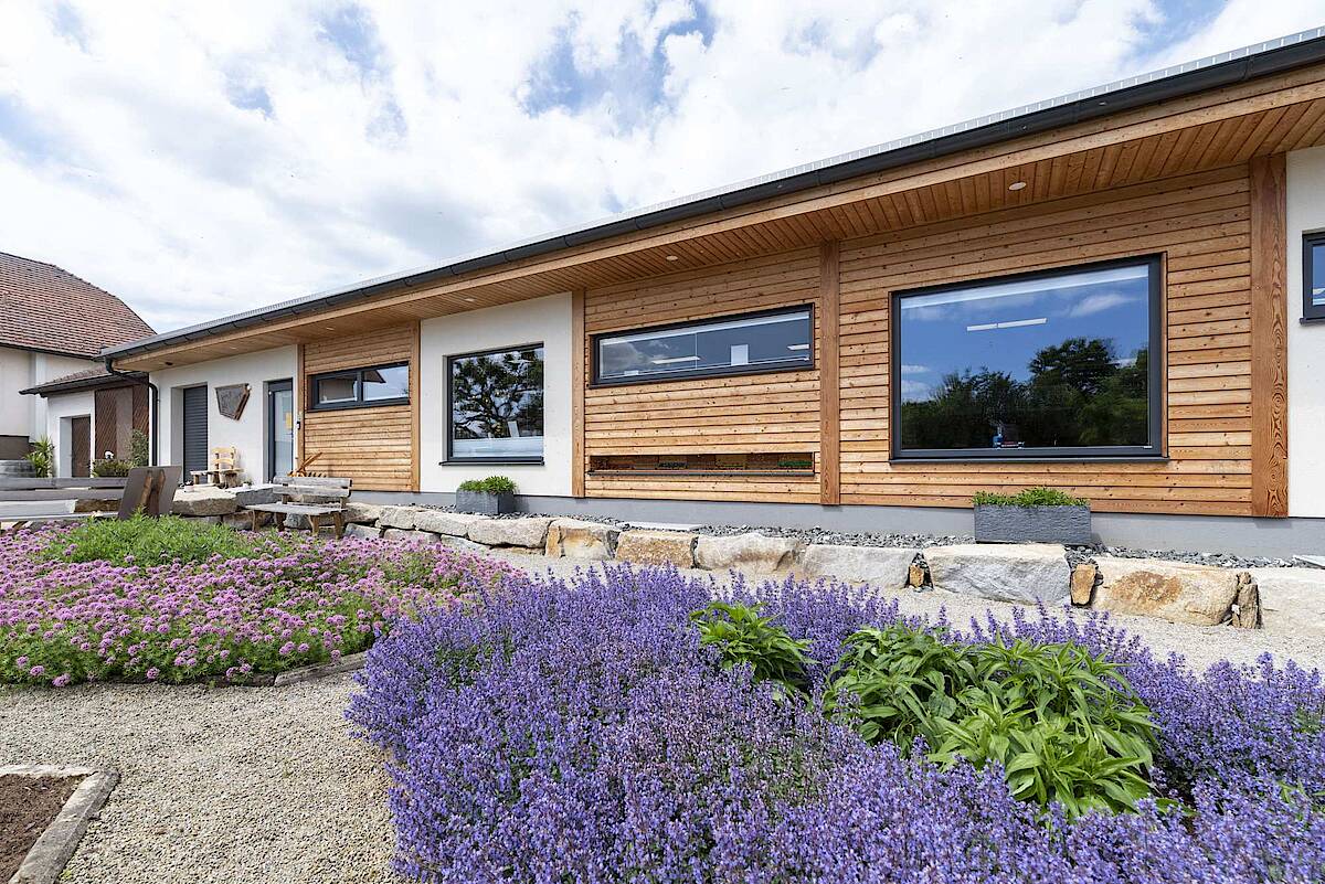 Der individuell geplante Bau weist einige Besonderheiten auf: So wurden sichtbare Konstruktionshölzer im Innenbereich rustikal nachbearbeitet um eine „Altholz-Optik“ zu erzielen. Der gelernte Tischler Alfred investierte dafür zahlreiche Stunden selbst. Und auch bei den Möbeln – wie der Schank und den Tischen - zeigte er sein Können..