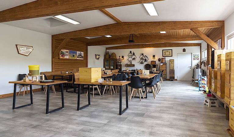Das über 300 Quadratmeter große neue Schaubienenhaus ist vollständig unterkellert und bietet neben einem Shop, kleiner Museumsecke und Verkostungsraum nun auch genug Platz für Busgruppen. Im Keller des neuen Gebäudes sind zudem die neuen Produktions- und Lagerräume für die vielfältigen Erzeugnisse der Imkerei untergebracht.