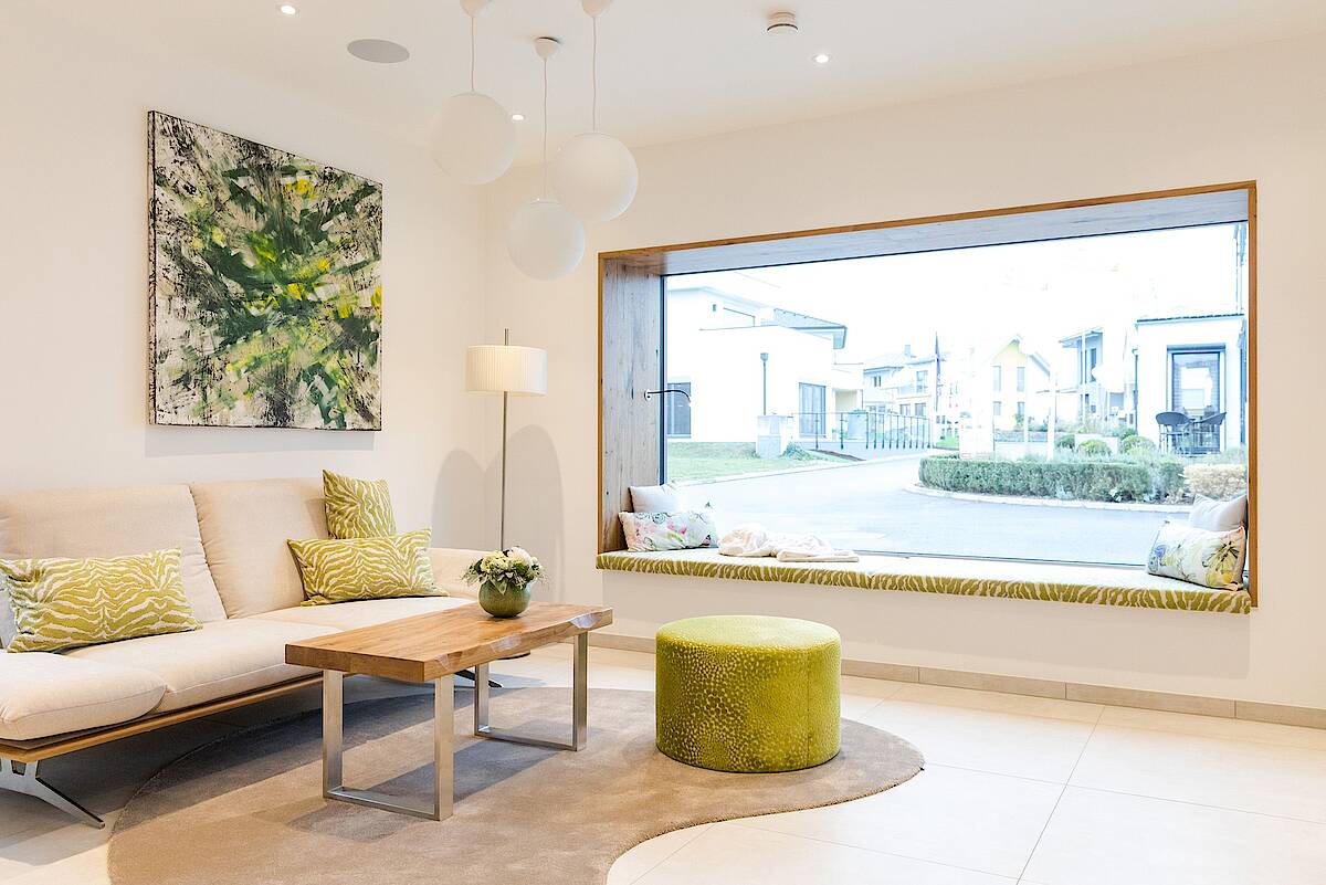 Das Musterhaus Elegance 136 W - New Life ist ein Zusammentreffen von innovativen Lösungen und komfortablem Wohnkonzept. Hierbei setzen wir nicht nur darauf, dass Sie dies alles sehen, sondern auf das Erleben dieses Hauses. Die Panoramafensterbank im Wohnzimmer ist perfekt, um dieses Hauskonzept zu demonstrieren. Hier können Sie es sich entweder mit einem guten Buch bequem machen, sich einfach die Umgebung ansehen oder gemütlich fernsehen. Durch das Harreithersystem hat diese Fensterbank immer ihre perfekte Wohlfühltemperatur, an heißen Tagen werden die Wandelemente gekühlt und an kalten strahlen diese eine angenehme Temperatur ab. Auch im Essbereich und im Bad wird das Wohlfühlklima durch verbaute Wandelemente von Harreither ohne unangenehme Nebeneffekte wie Zug oder kalte Füße angenommen. Besonders ins Auge sticht das 2,5 m hohe und raumbreite Hebeschiebeelement im 2,95 m hohen und zentralen Essbereich.